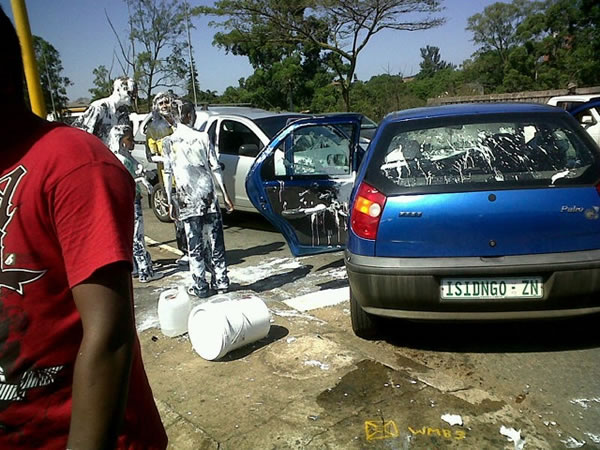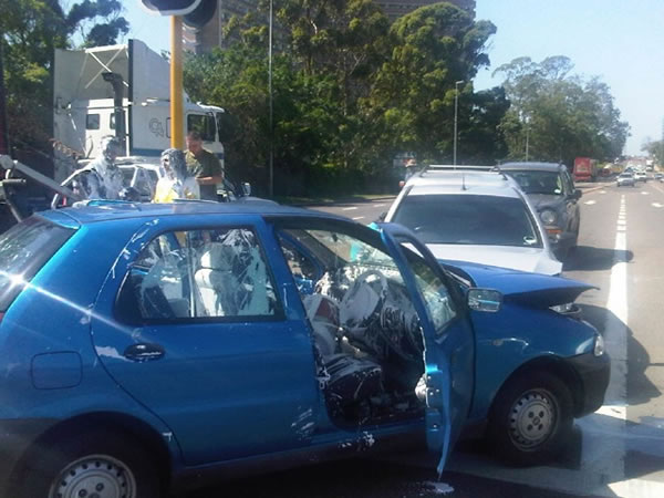 The people in the blue car had a 25-litre (5 gallon) bucket of paint on the back seat when they had the accident.